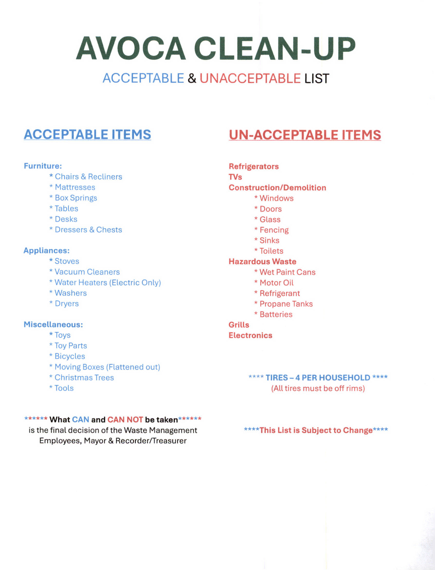 Fall Clean-up! October 11, 2025 8:30am-11:00am Across from Avoca Town Hall.  Click on each below for complete info!